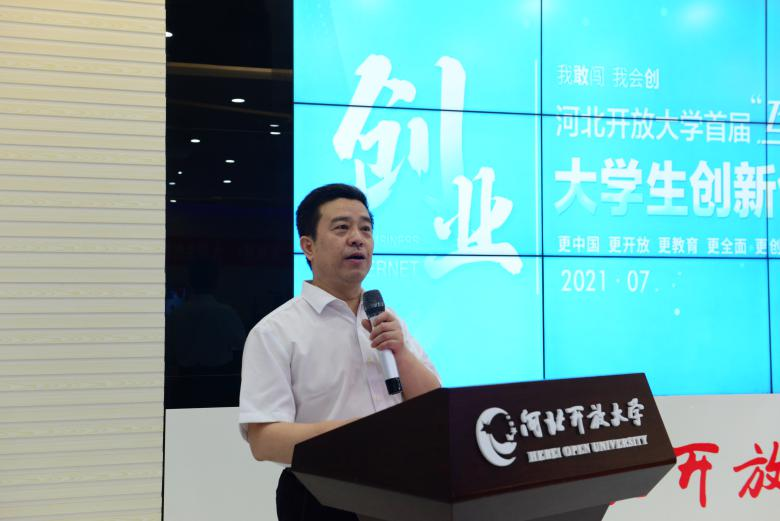 校長段潤保在致辭中指出,河北開放大學(xué)始終堅(jiān)持把創(chuàng)新作為引領(lǐng)發(fā)展的第一動(dòng)力,在人才培養(yǎng)、產(chǎn)教融合、雙創(chuàng)服務(wù)等方面聚焦發(fā)力,成為孕育創(chuàng)新創(chuàng)業(yè)種子的一片“沃土”,現(xiàn)在正在全力打造創(chuàng)新創(chuàng)業(yè)者實(shí)現(xiàn)夢(mèng)想的“搖籃”。并對(duì)大賽提三點(diǎn)希望:一是希望通過本次大賽,積極推進(jìn)創(chuàng)新創(chuàng)業(yè)教育融入人才培養(yǎng)全過程;二是希望專家評(píng)委們客觀評(píng)判、公正打分、悉心指導(dǎo),選拔出優(yōu)秀的選手;三是希望同學(xué)們牢固樹立創(chuàng)新意識(shí),將個(gè)人夢(mèng)想融入到偉大的“中國夢(mèng)”中,在創(chuàng)新創(chuàng)業(yè)大賽的舞臺(tái)上,盡情散發(fā)智慧,展現(xiàn)河北開放大學(xué)學(xué)子的青春風(fēng)采!