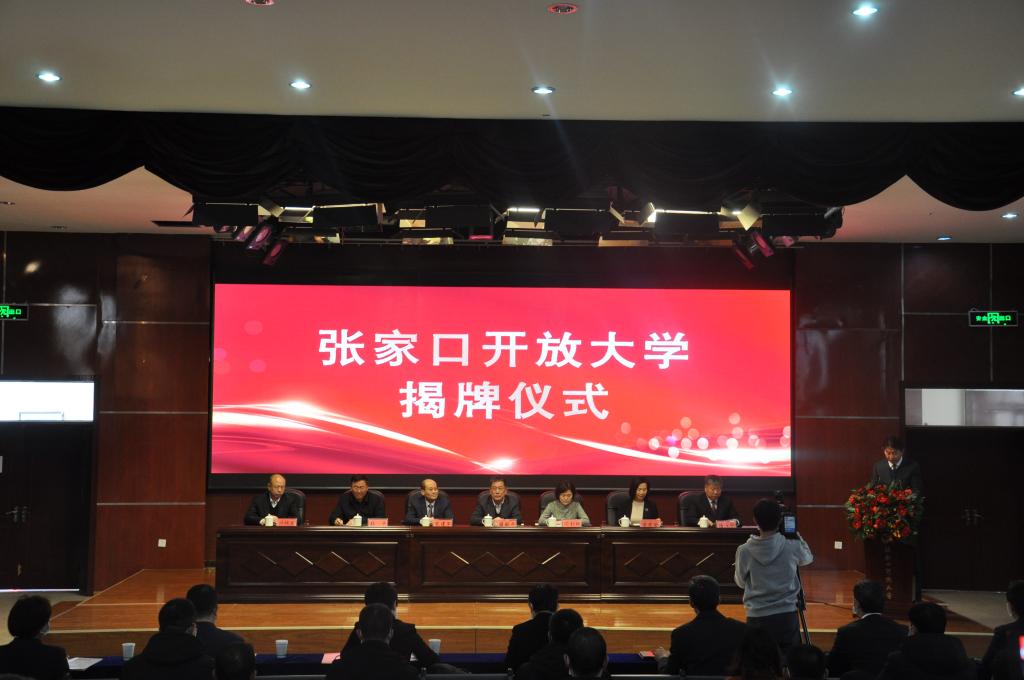 2021年12月18日,張家口開放大學揭牌儀式成功舉行。河北開放大學黨委書記籍獻平,張家口市政府副市長閆利艷,張家口市政府副秘書長宋建軍,張家口市委組織部四級調研員黃秀榮,張家口市委教育工委書記、市教育局局長杜平,市教育局副局長賀志英,張家口市職業技術教育中心黨委書記、校長李雪梅和副書記王玉民、原張家口廣播電視大學黨委書記許桂友,張家口開放大學黨委書記楊汝明、校長張宏文等出席揭牌儀式,揭牌儀式由張宏文主持,杜平宣讀了《河北省教育廳關于同意張家口廣播電視大學更名為張家口開放大學的函》。