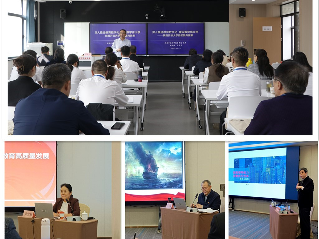 研討學(xué)習(xí)期間,陜西開放大學(xué)黨委書記、校長(zhǎng)龍治剛以《深入推進(jìn)教育數(shù)字化建設(shè)數(shù)字化大學(xué)——陜西開放大學(xué)的實(shí)踐與探索》為題,用實(shí)例證實(shí)了教育數(shù)字化是如何助力構(gòu)建服務(wù)全民終身學(xué)習(xí)教育體系和學(xué)習(xí)型社會(huì);副校長(zhǎng)吳宏梅以《以評(píng)估工作為抓手——推進(jìn)學(xué)校開放教育高質(zhì)量發(fā)展》為題,分步驟、分內(nèi)容詳細(xì)介紹了陜西開放大學(xué)推進(jìn)學(xué)校開放教育高質(zhì)量發(fā)展的過程;王鋒教授以《凝心聚力推進(jìn)中國(guó)式現(xiàn)代化建設(shè)》為題,使大家對(duì)中國(guó)式現(xiàn)代化建設(shè)的艱難歷程更加深刻的理解;西北大學(xué)教授陳實(shí)以《高校干部的領(lǐng)導(dǎo)力與執(zhí)行力》為題,講解了高校領(lǐng)導(dǎo)干部的組織能力與管理能力,更深層次的解讀了領(lǐng)導(dǎo)力和執(zhí)行力。