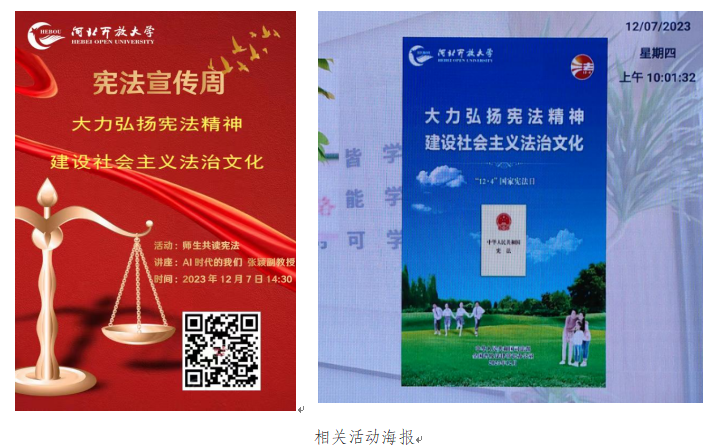 2023年12月4日是我國第十個國家憲法日,12月1日至12月7日是第六個“憲法宣傳周”,今年“憲法宣傳周”主題為“大力弘揚憲法精神,建設社會主義法治文化”。為了認真學習宣傳貫徹習近平法治思想、習近平文化思想,持續弘揚憲法精神,維護憲法權威,提升我校師生法治素養,教學支持部聯合科研與規劃處開展河北開放大學體系“憲法宣傳周”主題活動。12月7日下午,集中組織河北開放大學體系師生進行“師生共讀憲法”和“AI時代的我們”專題講座活動。
