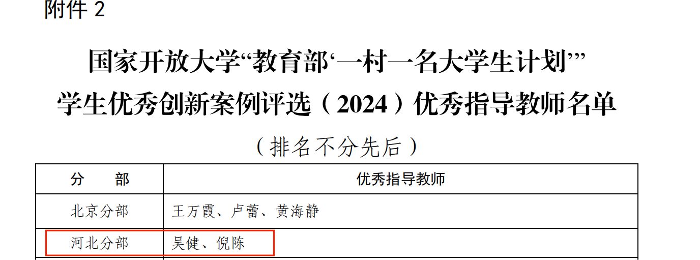 國家開放大學“教育部‘一村一名大學生計劃’”學生優秀創新案例評選結果于日前公布,我校推薦的《“春”風化雨“潤”心田——助力鄉村振興,我們一直在路上》(滄州開放大學 袁振強)在參評的93個創新案例中脫穎而出,喜獲一等獎。指導教師吳健、倪陳被評為優秀指導教師。至此,國家開放大學組織的“教育部‘一村一名大學生計劃’”招生先進單位、優秀教學單位和優秀科研成果評選,主題征文及創意視頻征集和學生優秀創新案例評選活動全部圓滿結束。因參賽積極、組織精心、成績突出,我校榮獲國家開放大學“一村一名大學生計劃”系列評選與征集活動優秀組織獎。