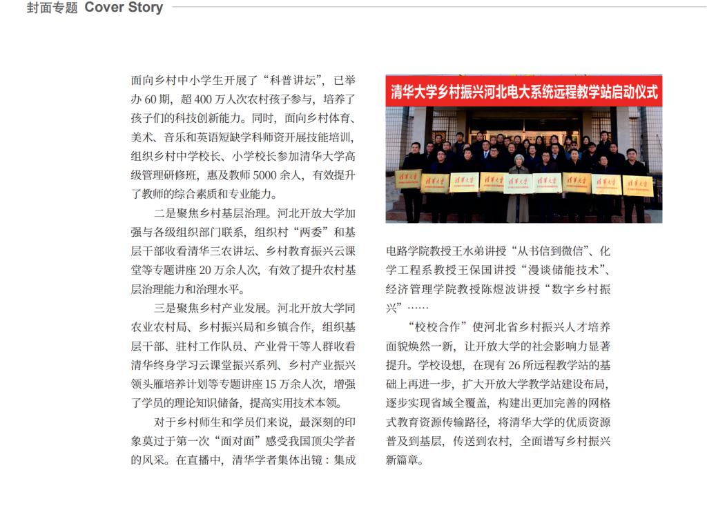 【編者按】近日,由教育部主管,國家開放大學主辦,《中國遠程教育》雜志社出版的《在線學習》期刊,在2024年4月(月刊)/總102期中的“發力!鄉村振興,高校擔當”封面專題中,以《校校合作,讓清華優質資源惠及燕趙大地》為題,刊載我校鄉村振興的典型事跡。