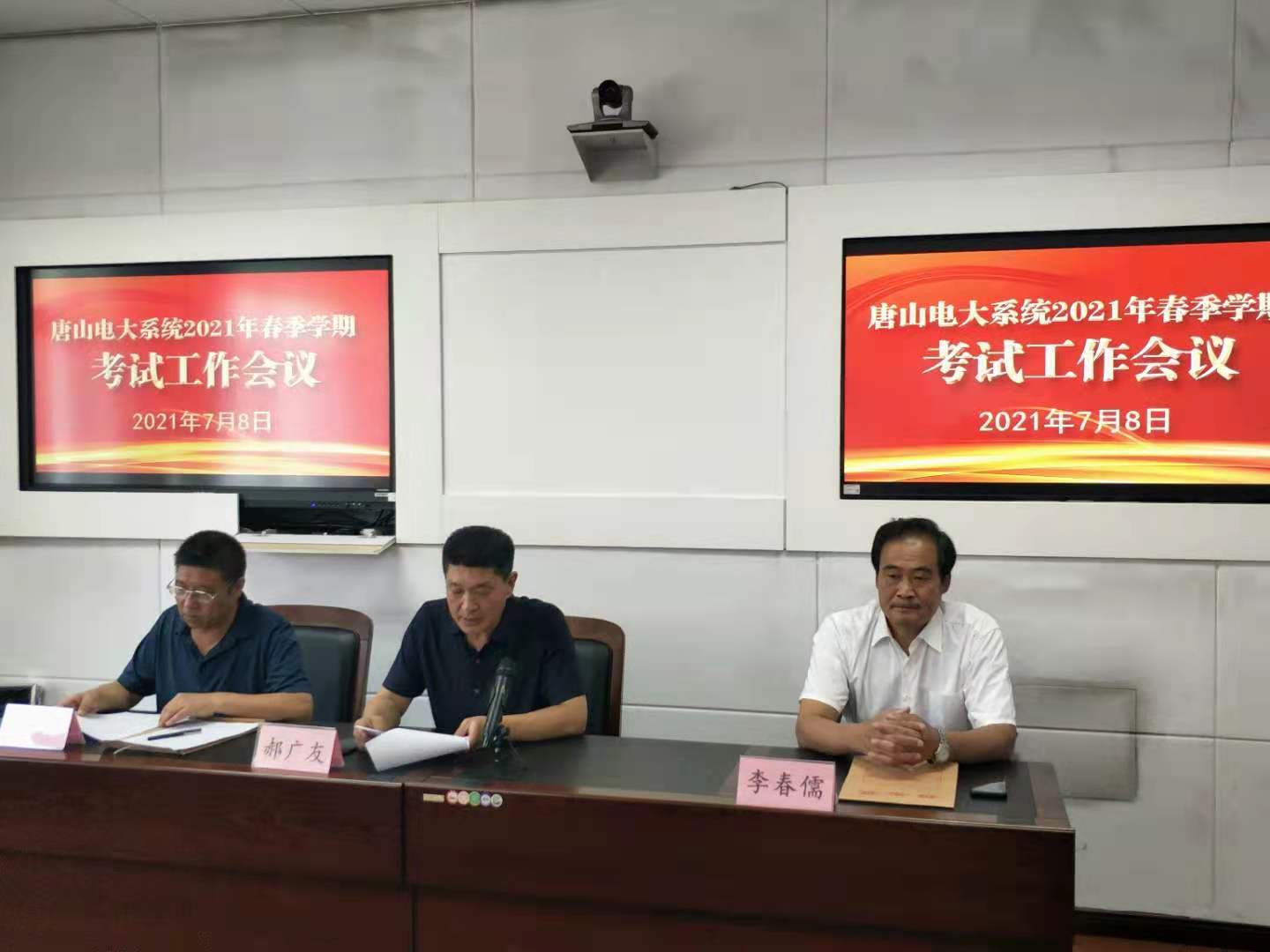 2021年7月8日上午8:30-10:00,唐山電大在學校遠教樓三層云教室召開了全市電大系統(tǒng)2021年春季學期考試工作會議。唐山電大黨委書記、校長郝廣友、副校長李春儒、教務處處長秦立功、各縣(市)區(qū)分校主管考務工作副校長和教務處主任、各考點巡考人員參加了會議。