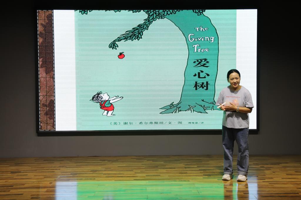 繪本被譽為“人生的第一本圖書”,作為一種以圖畫為主要表現內容和形式的讀物,鮮艷的色彩、巧妙的構圖以及與生活經驗密切相關的故事情節符合兒童早期閱讀的特點和習慣,能夠引起兒童情感共鳴,深刻感受閱讀樂趣。本次活動選擇的是世界經典繪本作品——《愛心樹》。專業繪本指導師通過“切入—導讀—設疑—討論—精讀—遷移”的繪本教學六步法,講述一棵樹和一個男孩兒的故事,從中挖掘蘊含的教育價值,通過不同層面的解讀,將其演繹成生動、豐富的閱讀活動,讓孩子理解什么是“付出”,什么是“得到”,什么是“愛與被愛”。孩子們讀得開心、學得開心、玩得開心,氣氛熱烈、互動積極、效果良好。