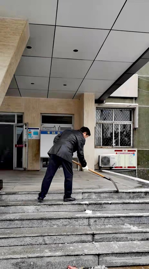 家住開發區的羅小勇老師是秦皇島開放大學第五支部的支部書記,他主動聯絡附近出行不便的同事,清晨六點多就做好準備,繞路接載多名同事,以便于能夠安全、準時地將大家送到學校。總務處處長秦永杰老師是第四支部的黨支書,心系學校環境安全,清晨七點多出發,步行到校后就直接拿起工具,清理起臺階上的浮冰,消除安全隱患。