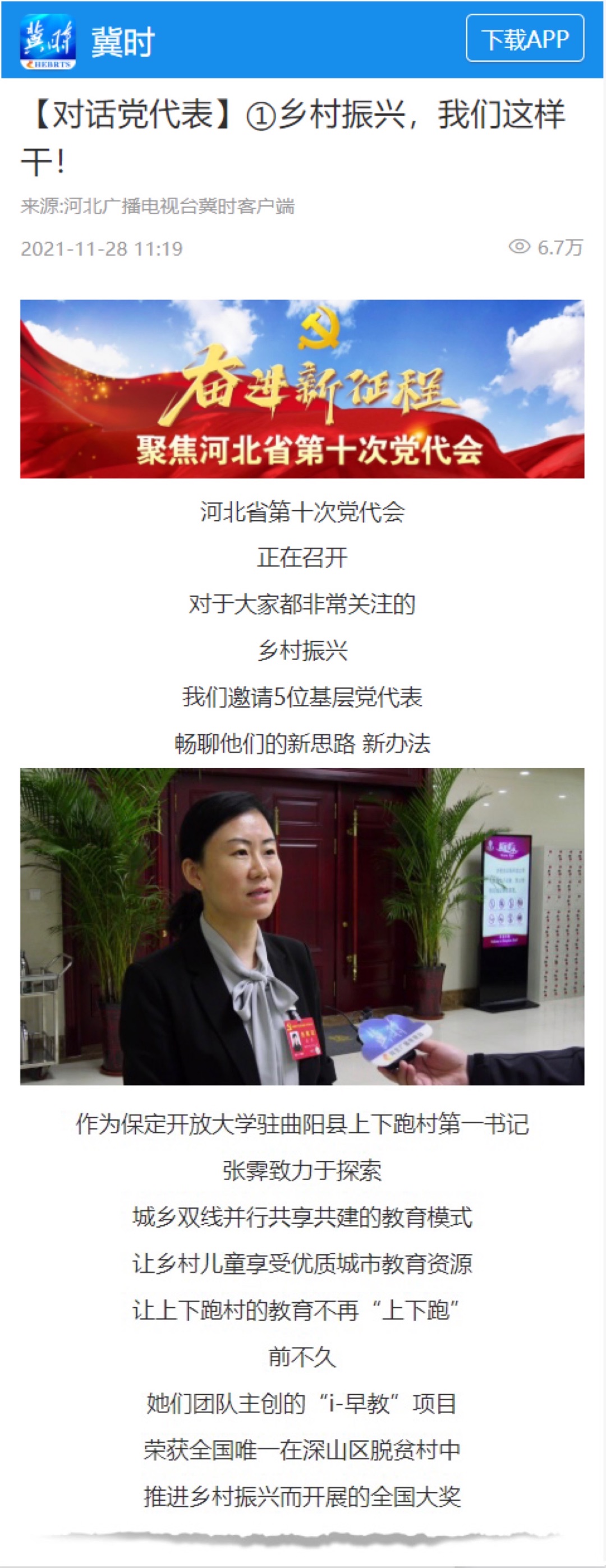 人物介紹:張霽,保定開放大學社區教育處處長、駐曲陽縣上下跑村工作隊隊長兼第一書記,河北省脫貧攻堅先進個人、河北省扶貧脫貧優秀駐村第一書記。2021年10月當選河北省第十次黨代會代表。