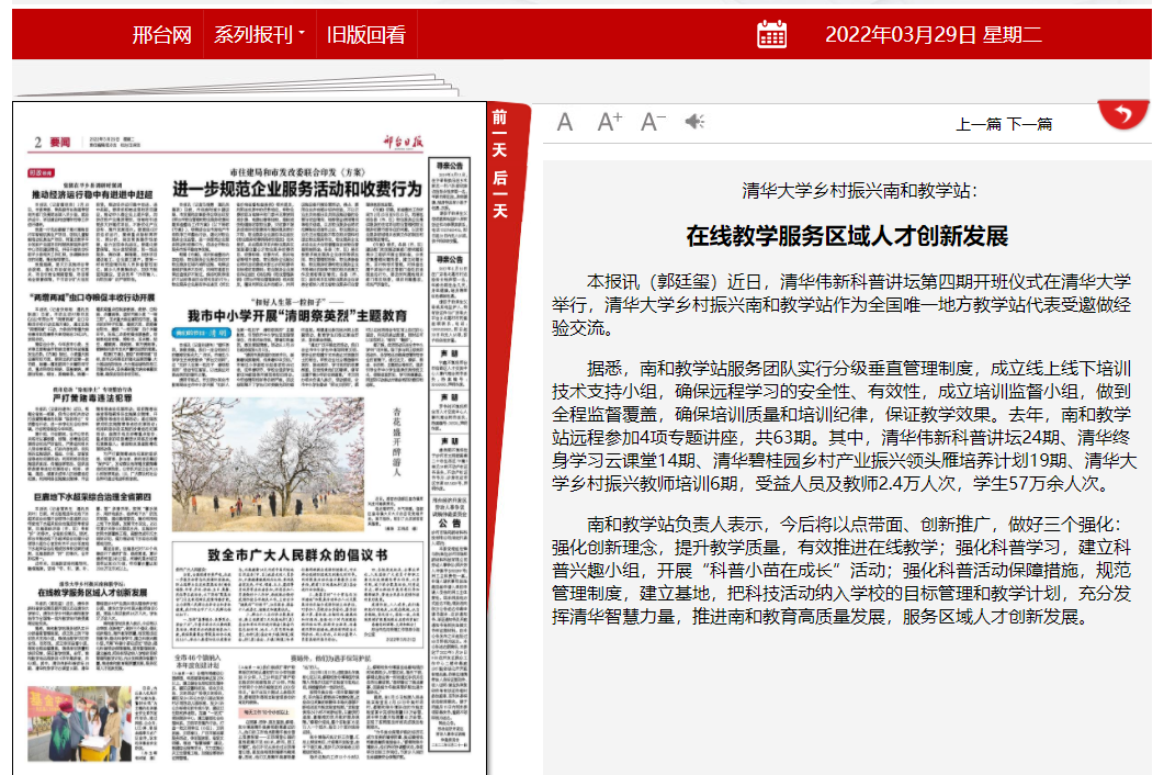 3月29日,《邢臺日報》第二版編發“清華大學鄉村振興南和教學站:在線教學服務區域人才創新發展”新聞,對邢臺開放大學南和分校作為清華大學鄉村振興遠程教學站全國唯一地方教學站代表,在清華偉新科普講壇第四期開班儀式上交流經驗予以報道。