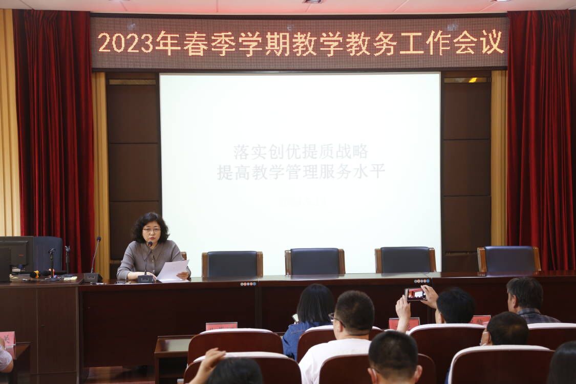 2023年5月16日,秦皇島開放大學召開了2023年春季學期教學教務工作會議。我校全體教職工、各縣區學習中心主管校長及負責教學教務人員參加了本次會議。會上副校長賈向宏以《落實創優提質戰略,提高教學管理服務水平》為主題安排布置教學教務工作,她指出今年教學教務的主要任務為:抓制度建設、抓教師隊伍建設、抓教學質量管理、抓實抓細各項服務、抓教學科研、為辦學評估做準備。