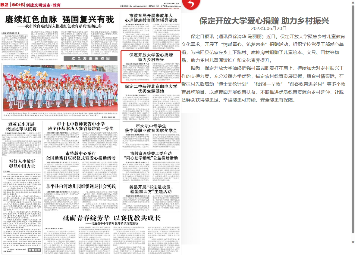 保定日報訊(通訊員徐清華 馬麗麗)近日,保定開放大學聚焦鄉村兒童教育文化需求,開展了“情暖童心、筑夢未來”捐贈活動,組織學校黨員干部愛心募捐,為曲陽縣范家莊鄉上下跑村、虎神溝村捐贈了兒童繪本、文具、畫材等物品,助力鄉村兒童閱讀推廣和文化素養提升。