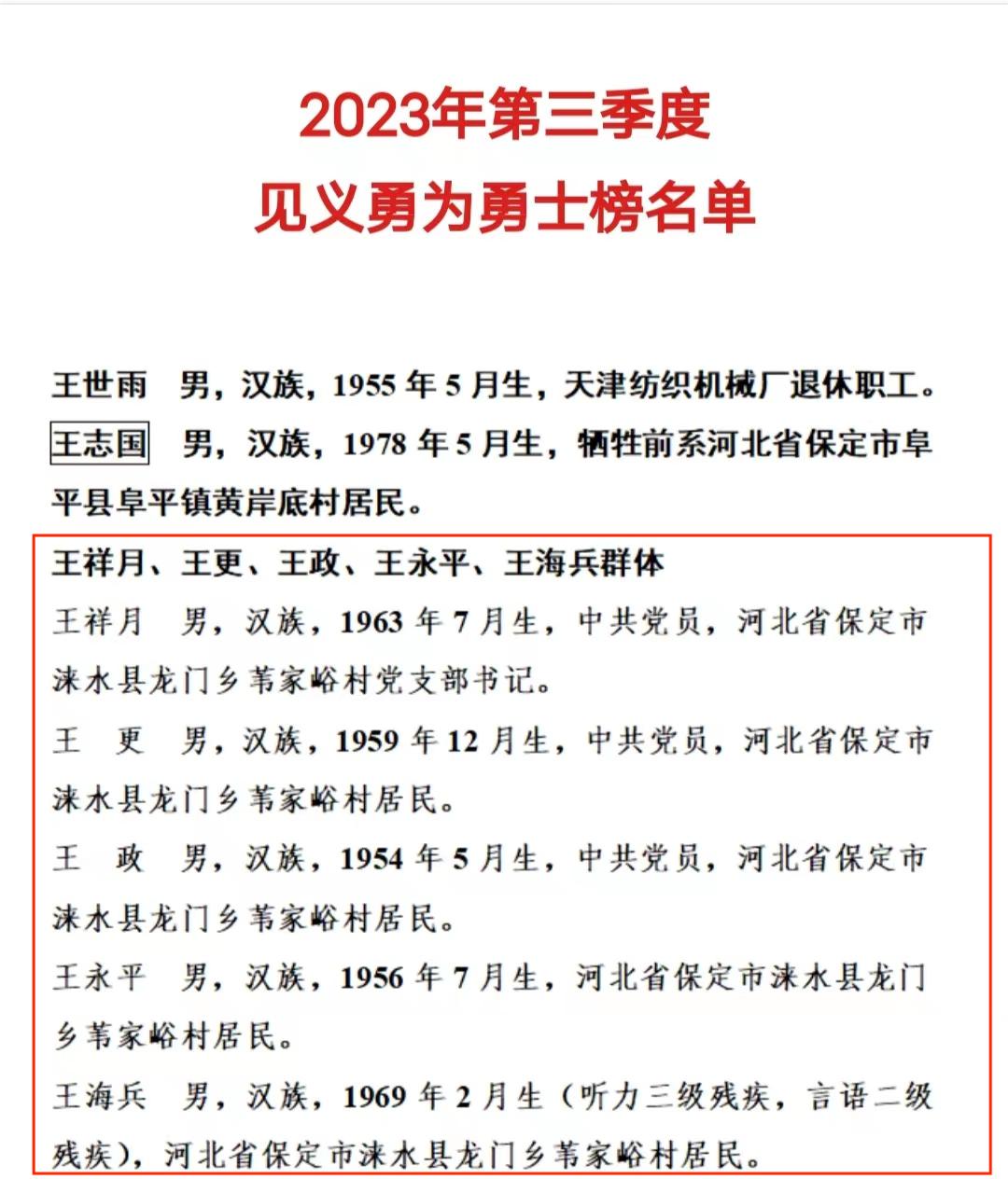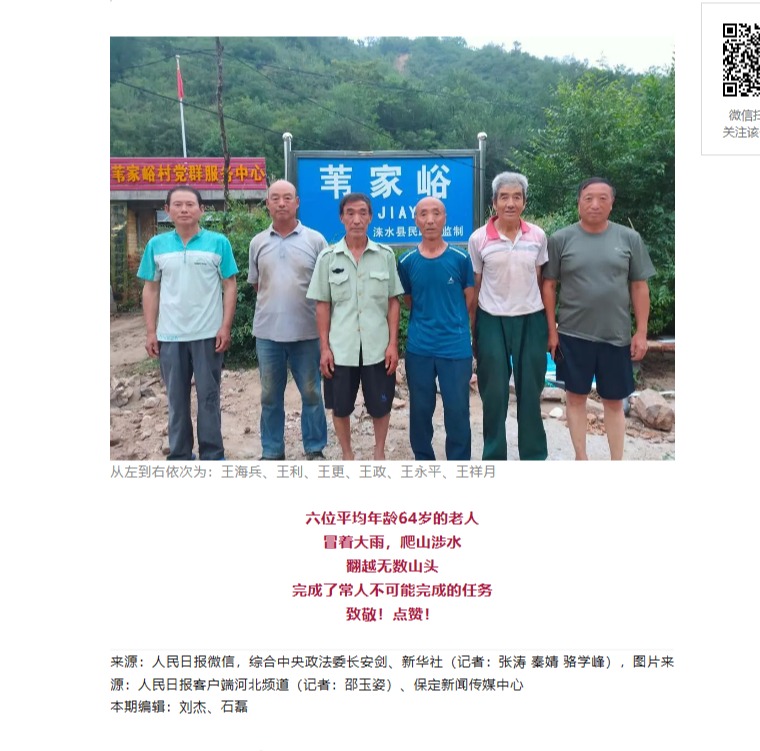 王祥月,中共黨員,葦家峪村黨支部書記,系淶水開放大學21春一村一行政管理(鄉村管理方向)學員。2023年7月31日,河北省淶水縣龍門鄉下著大暴雨,平均年齡64歲的王祥月等六位老人,用一副簡易擔架,抬著180斤重的受傷村民,跋山涉水,經歷兩天兩夜,成功把傷者送醫救治。2023年10月9日,中央政法委發布2023年第三季度見義勇為勇士榜,來自河北淶水的平均年齡六十多歲的王祥月等多位老人光榮上榜。(撰稿:黃秀青 校對:王巖 審核:趙甫安)