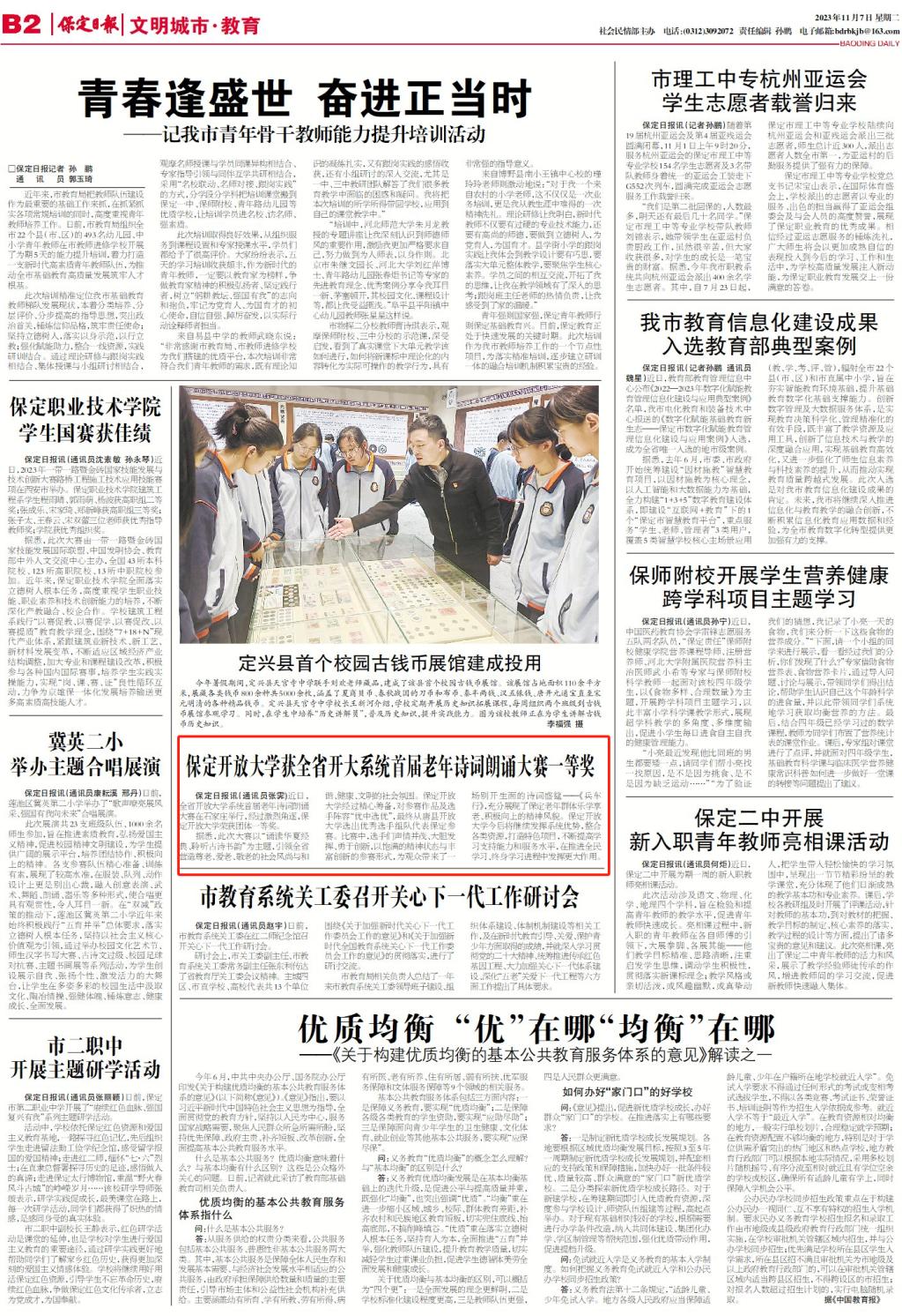 近日,全省開放大學系統首屆老年詩詞朗誦大賽在石家莊舉行,全省各地市積極響應、踴躍參加,經過激烈角逐,保定開放大學榮獲團體一等獎。《保定日報》、保定新聞傳媒中心對此進行報道。(撰稿:徐浩 校對:張霽 審核:馬俊瑞)