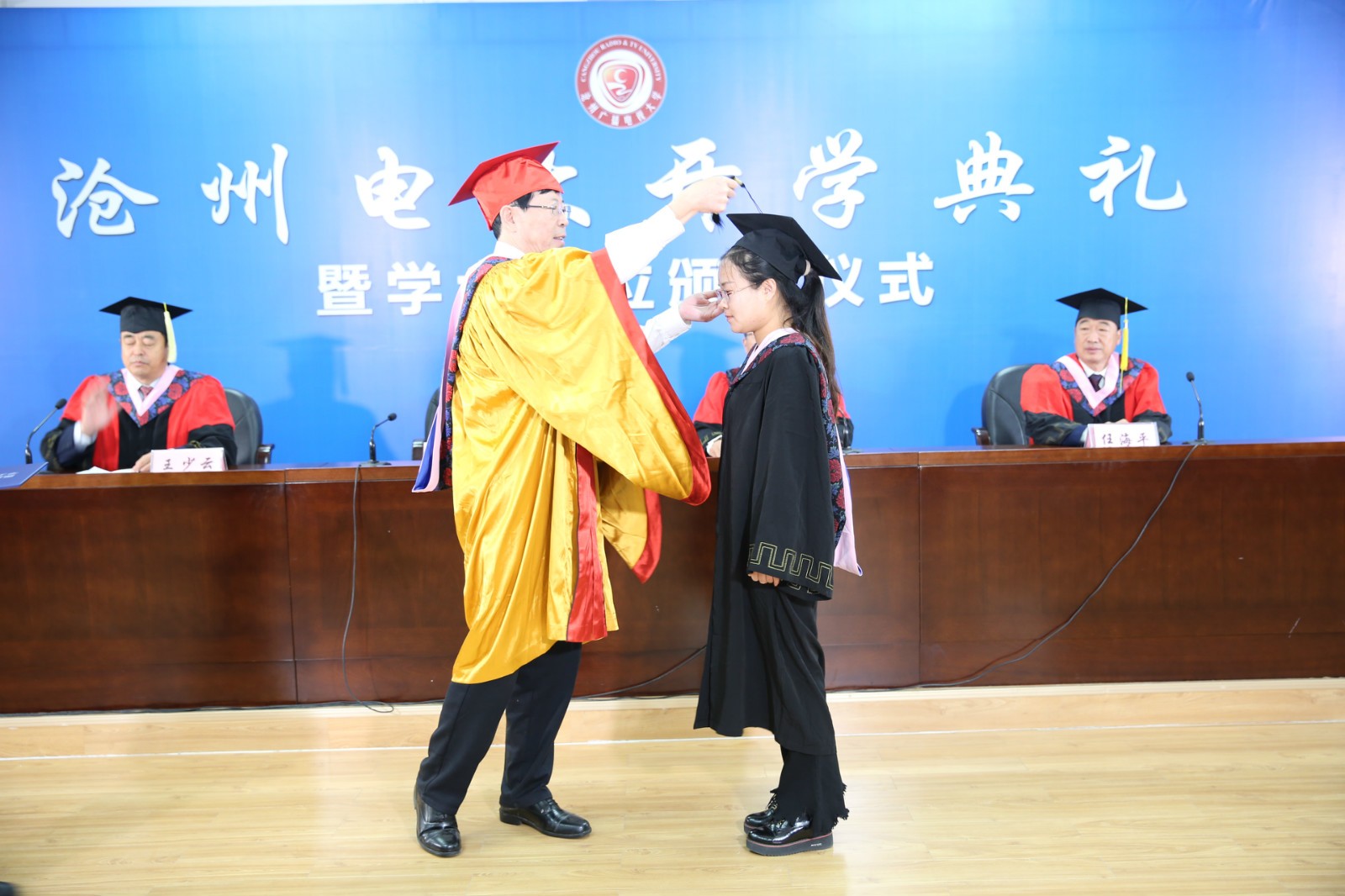 上午十點整開學典禮開始。全場高唱中華人民共和國國歌。副校長王金嶺宣讀獲得2017級學士學位名單,楊書記為每一個獲得學士學位的學員正冠、撥穗、頒發證書、合影留念。
