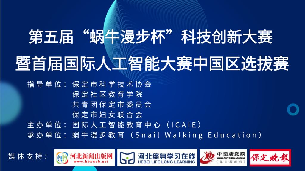 2020年12月20日,由保定社區教育學院作為指導單位,蝸牛漫步教育承辦的第五屆“蝸牛漫步杯”科技創新大賽暨首屆國際人工智能大賽中國區選拔賽開幕式在蝸牛漫步人工智能教育中心隆重舉行。