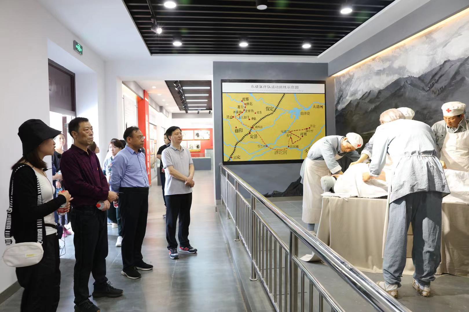 在白求恩戰地手術室展館,黨員們共同參觀了戰地手術室——一間幾平米的小廟,在這里,白求恩奮戰三天三夜,共搶救了115名傷員,最終不慎感染病毒,犧牲在了60多公里外的唐縣。展館內,白求恩大夫做手術的蠟像完美地還原了小學生課本里《手術臺就是陣地》的配圖照片,一件件器物、一張張照片、一段段文字深刻地詮釋了“不畏艱苦、甘于奉獻、救死扶傷、大愛無疆”的白求恩精神。