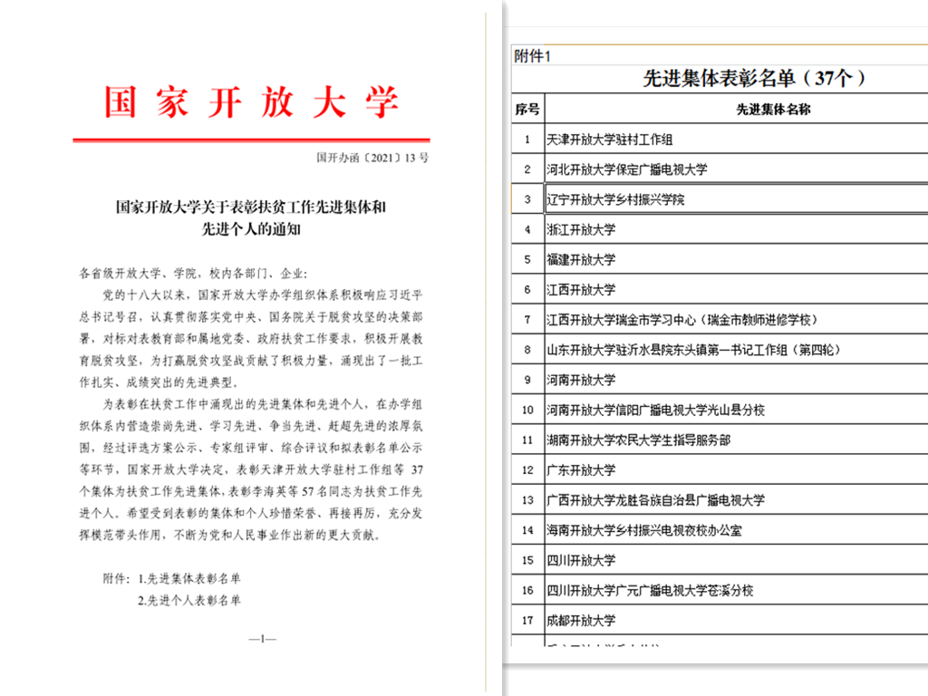 日前,國家開放大學(xué)印發(fā)《關(guān)于表彰扶貧工作先進(jìn)集體和先進(jìn)個(gè)人的通知》(國開辦函〔2021〕13號(hào)),對(duì)系統(tǒng)內(nèi)37個(gè)扶貧先進(jìn)集體和57名扶貧先進(jìn)個(gè)人進(jìn)行了表彰,保定電大獲評(píng)國家開放大學(xué)“扶貧工作先進(jìn)集體”。